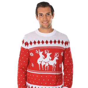 Det senaste inom jultröjor är definitivt modeller med 3D-motiv. Julgranskulor som hänger på bröstet, fastsydda julklappar, rosetter på ryggen, tröjor som blinkar, renar som ser ut att gå rakt igenom ryggen – det finns många annorlunda modeller. En särskilt speciell variant är så kallade carry me-tröjor. Med en sådan blir halva du en ren, en jultomte eller något annat. Du gör garanterat en storstilad entré om du äntrar julbordet buren av Rudolf med röda mulen!